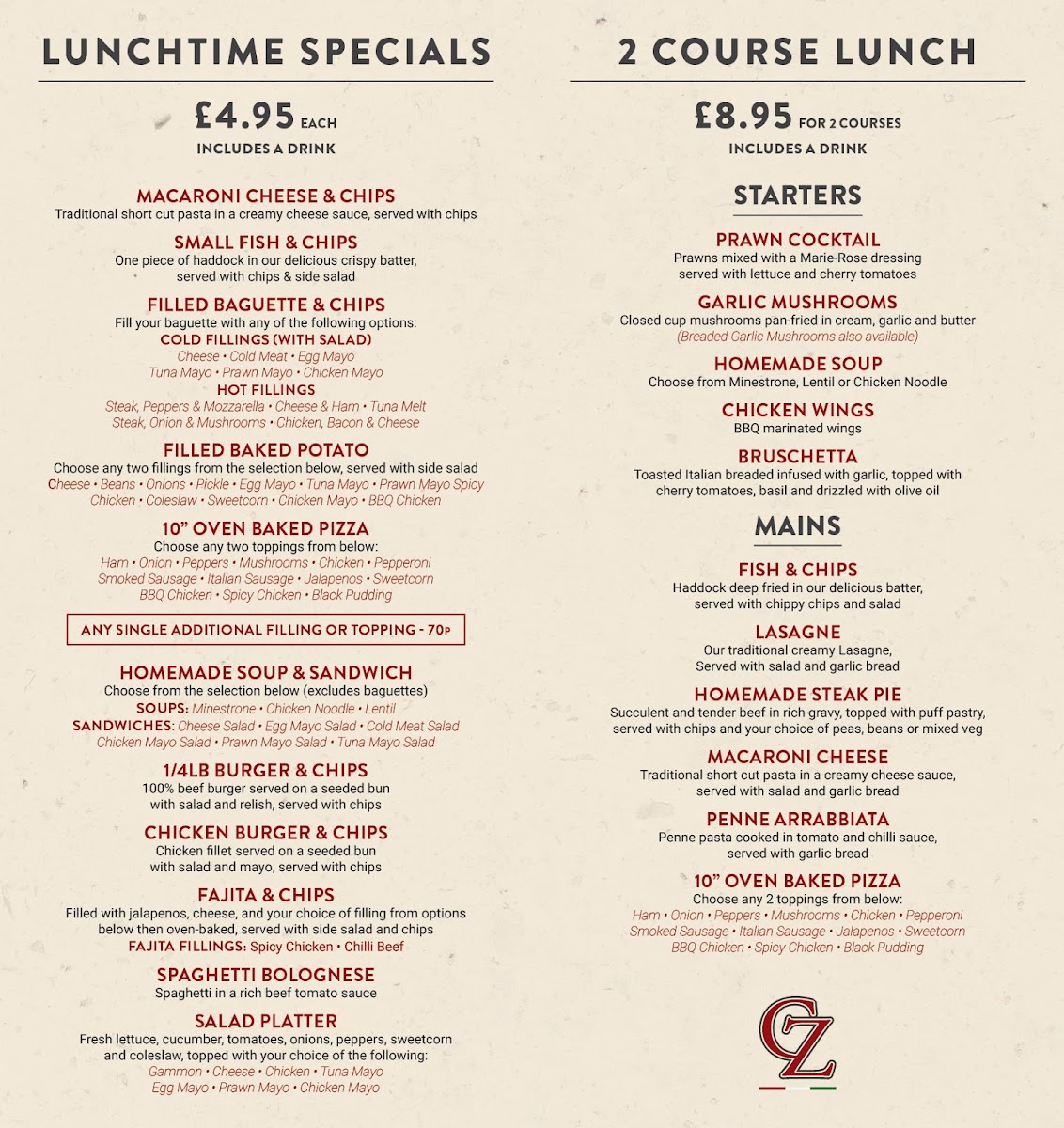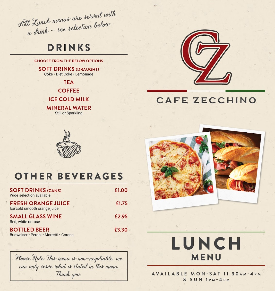 Cafe Zecchino specializes in classic British fare, offering a delightful menu that includes beloved dishes such as fish & chips, which are perfectly crispy and accompanied by a rich curry sauce, and the homemade steak pie, known for its tender meat and flaky crust. If you're craving pasta, the macaroni cheese and penne arrabbiata are both crowd-pleasers, satisfying those comfort food cravings. For pizza lovers, the 10” oven-baked pizza promises a delightful crunch, a true testament to the craft of pizza-making that local customers rave about.